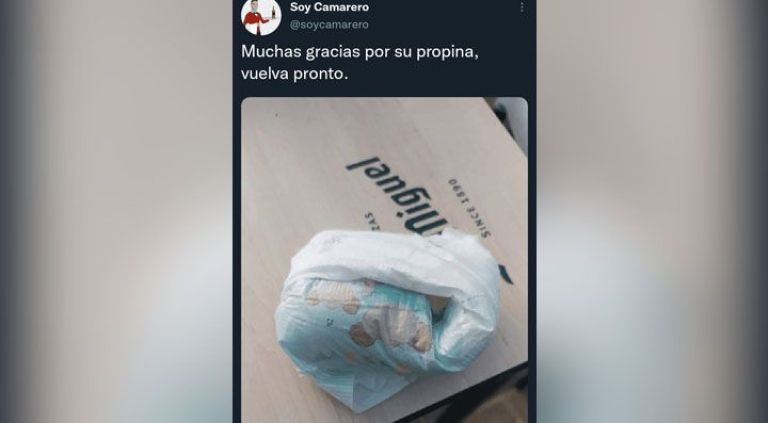 “Muchas gracias por su propina, vuelva pronto”, dice el tuit acompañado por una imagen de una mesa de un bar con un pañal usado dejado por unos clientes para que lo recojan los empleados.