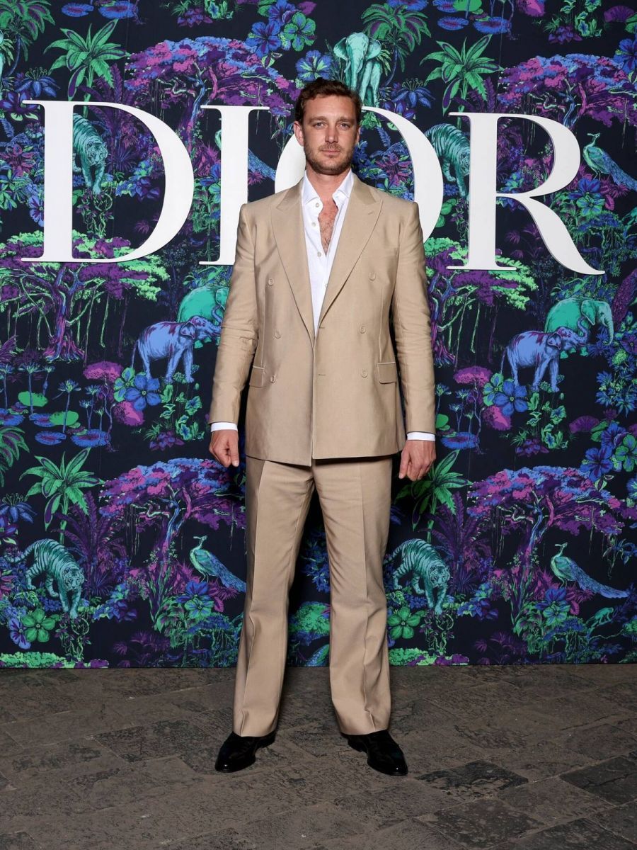 Su acompañante y esposo, Pierre Casiraghi, hijo menor de Carolina, deslumbró con un elegante traje en color camel, con chaqueta, camisa blanca, pantalones, y zapatos brillantes en color negro.